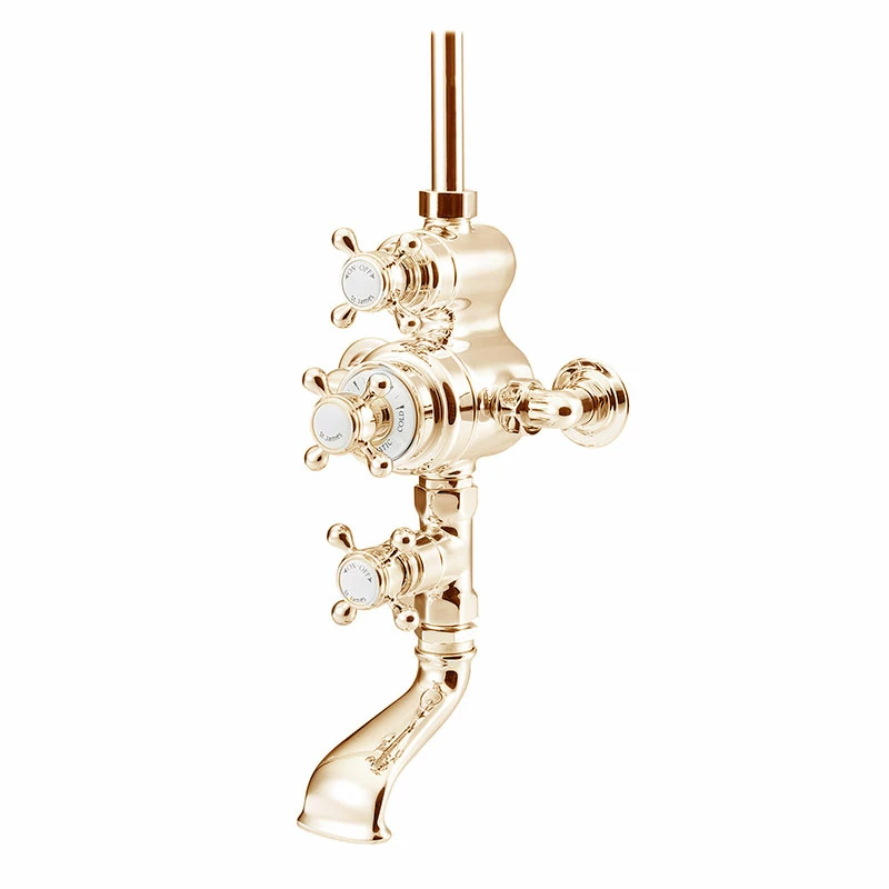 The St James Antique Gold Traditional Exposed Valve and Bath Filler is the ideal purchase to complete a classic, period shower. The beautiful porcelain and dials create a traditional feel. However the chrome finish allows this piece to fit in easily to a more modern bathroom setting. Furthermore all St James Showers are made in solid brass then hand polished to give you the highest quality product.